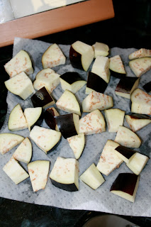 The main vegetables in this dish -- fennel, potatoes, and carrots -- are prepared first. Peel and chop the carrots and potatoes (the recipe actually calls for fingerling or new potatoes, but I only had regular ones, so I prepared them in the same way) and put them in boiling water for about 5 minutes, just until they're starting to soften. Drain the veggies and place them in a bowl along with quartered fennel bulbs, garlic, lemon juice, and olive oil.